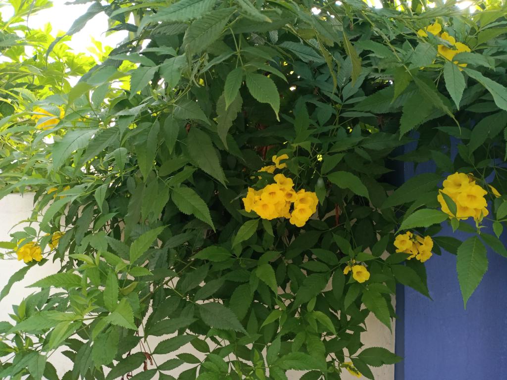 Tecoma stans grows rapidly, with its branches being quite lengthy. Each branch can extend between 5 and 7 feet. The tree produces numerous flowers, resulting in a vibrant yellow and green appearance.